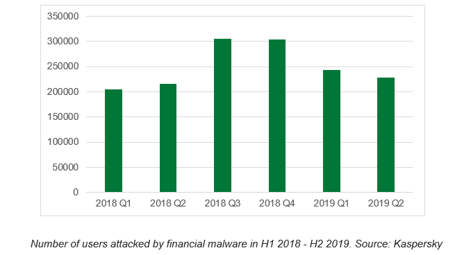 En la primera mitad de 2019, 430.000 usuarios han hecho frente a programas maliciosos que tenían como objetivo robar dinero, criptomonedas y servicios de pago por Internet. Esto representa un crecimiento del 7% con respecto al mismo periodo del año anterior.